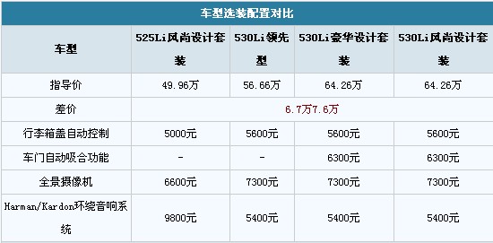 530Li領(lǐng)先版相比525Li豪華(風(fēng)尚)設(shè)計(jì)套裝在配置方面只是少了前排座椅腰部支撐、高保真揚(yáng)聲器系統(tǒng),而6.7萬(wàn)元的價(jià)格差異有些不值。