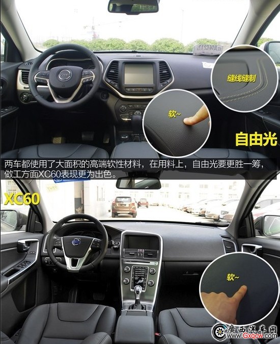 自由光中控臺采用“鷗翼式”設(shè)計,在傳承家族特色的同時傳又融入了潮流多變的線條。XC60懸浮式中控也完完全全的走著家族模式,突出家居氣息。在用料上,兩者不相上下,清一色的軟性材質(zhì),自由光上的軟性材料還使用了縫線縫制,手感上已經(jīng)接近真皮材料,挺會唬人的。在細(xì)節(jié)的處理上,XC60做的自然要做的更為細(xì)膩一些,但自由光的內(nèi)飾做工也算完全顛覆了之前我們對美系車那種粗糙的印象。