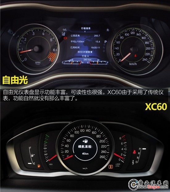 自由光儀表盤除了兩個傳統(tǒng)的轉(zhuǎn)速表和時速表之外,中央還配備了一款7英寸的彩色液晶顯示,除了可以數(shù)字模擬,還可以顯示屏胎壓監(jiān)測、行駛里程、瞬時油耗、定速巡航、ACC自適應(yīng)系統(tǒng)等信息,可讀性也很強,絕對算是高大上了。XC60由于采用了傳統(tǒng)儀表,功能自然就沒有那么豐富了,并且將駕駛員的視線重心都集中在時速表上,兩邊的轉(zhuǎn)速表和eco模式表就顯得太小而不太直觀了。