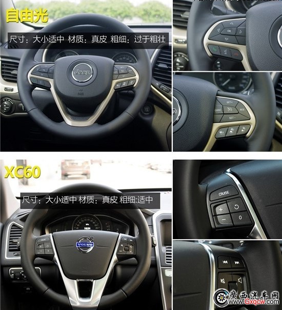 同樣是三輻式方向盤,同樣都采用了皮質(zhì)包裹,大小也相當(dāng)。不同之處是自由光方向盤設(shè)計的較為為粗壯,就個人體驗而言,XC60方向盤握感剛好,自由光方向盤就有稍有些粗壯,對于我這樣一個手不大的人來說,感覺有些握不過來。當(dāng)然,對于一些手掌大的駕駛者來說,他們可能會更喜歡自由光的握感。兩車方向盤上都集成了多功能按鍵,自由光顯然要更為豐富。