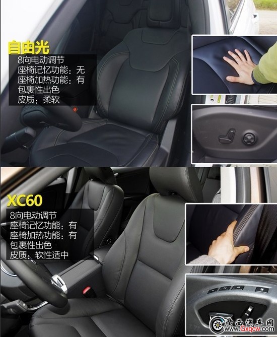 兩車的座椅都采用真皮包裹,駕駛席座椅同樣支持8向電動調(diào)節(jié)。座椅的包裹性跟舒適度都屬于同級別出類拔萃的級別,相比于XC60,自由光座椅的填充物要更為厚實,皮質(zhì)手感也要更為柔軟,當(dāng)然,前提是XC60座椅舒適度已經(jīng)足夠優(yōu)異的情況下。