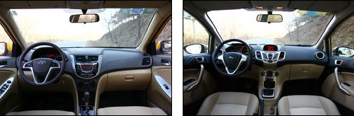 在兩車內(nèi)部的視野上,瑞納要優(yōu)于嘉年華的表現(xiàn)。嘉年華的前風(fēng)檔和前機(jī)艙線條比較傾斜,一定程度上減小了風(fēng)阻,但坐在車內(nèi)的前排乘客很難清晰地看到前機(jī)艙的左右兩角,容易錯(cuò)誤估計(jì)與前車尾的距離。瑞納則沒有出現(xiàn)這種問題,前面的視野相對比較開闊。