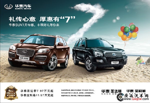 南寧的酷暑夏日,你準(zhǔn)備好了么?7月活動(dòng)多多, 18日-21日廣西第二屆國際汽車文化節(jié),華泰汽車與您相約南寧國際會(huì)展中心11號(hào)館。年中鉅惠,禮傳心意,厚惠有“7”!華泰SUV7月特惠,豐厚好禮等你來!此外,寶利格1.8T自動(dòng)擋將攜手路盛E70亮相車展現(xiàn)場,訂、購車客戶將有神秘大禮抱回家,到展位品鑒賞車客戶均有精美禮品贈(zèng)送,全系再度無底線回饋新老客戶!詳詢:0771-3801127 地址:南寧市安吉路41號(hào)廣西汽車市場內(nèi)