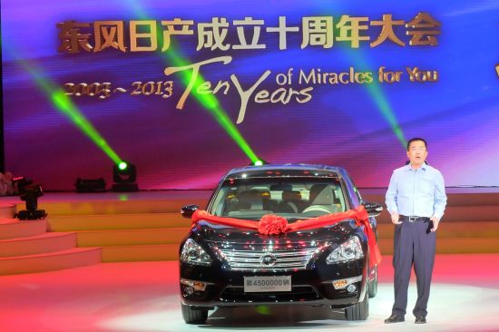 2013年6月16日,東風(fēng)日產(chǎn)成立十周年大會在廣州舉行。大會現(xiàn)場現(xiàn)場,一輛剛剛從生產(chǎn)線上開出來的新世代天籟,緩緩駛出舞臺。而這正是東風(fēng)日產(chǎn)生產(chǎn)的第450萬輛整車。在成立十周年之際,東風(fēng)日產(chǎn)的成功不僅見證了中國汽車界的成熟與發(fā)展,更迎來了一個全新時代的競爭與挑戰(zhàn)。