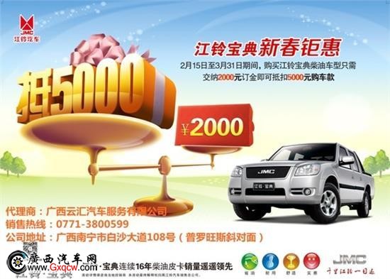 一年之計(jì)在于春,馬年伊始,江鈴汽車推車馬年購車優(yōu)惠,讓您體驗(yàn)“馬年有寶典,馬上有驚喜 ”的鉅惠,凡在3月1日至3月31日期間進(jìn)店購買江鈴寶典柴油系列車型,您就能馬上享受3000元的現(xiàn)金優(yōu)惠活動,這是去年至今江鈴寶典*大的讓利活動。