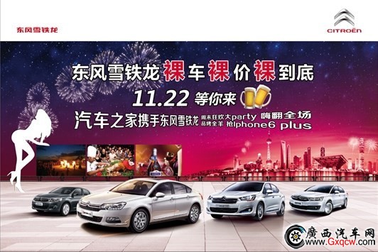 那么問題來了,團購力度哪家強?找東風雪鐵龍11.22裸車裸價裸到底,南寧車市一股購車狂歡大派對正席卷而來! 11月22日,汽車之家攜手東風雪鐵龍舉辦“裸車裸價裸到底”活動鄭重承諾,價格突破底線,全年最低,買貴補差價,不需您勞心勞力砍價,只需動動您的手指,就能輕松獲得底價,到店試駕即送法國高檔紅酒一支!參與活動不僅能享受特惠價格,當天購車還可參加抽獎活動,Iphone6 plus,52電視機,Ipad mini,山地自行車,拉桿箱等等多重豪禮拿到你手軟,購車后上傳發(fā)票還可再獲得汽車之家送出的金屬質感車標哦!!當天前20名訂車的網友均可獲贈價值580元的拉桿箱一個。來吧!周末帶上您的家人,加入我們的狂歡大派對,吃個夠喝個夠玩?zhèn)夠!