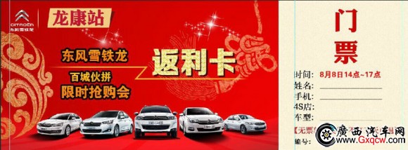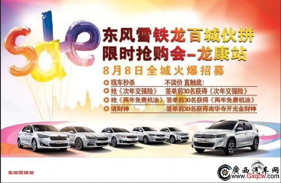 8月8日,南寧車市會(huì)發(fā)生一件大事情,東風(fēng)雪鐵龍廠家回饋廣大車主,東風(fēng)雪鐵龍百城伙拼廠價(jià)風(fēng)暴限時(shí)搶購(gòu)會(huì)。本次活動(dòng),廠家直接給予最“抵”價(jià),為您購(gòu)車省時(shí),省心,省力,拿到大實(shí)惠。憑借100元門票進(jìn)場(chǎng),直接拿到廠家贈(zèng)送的價(jià)值2000元的2年原廠機(jī)油,媒體贈(zèng)送的價(jià)值950元的次年交強(qiáng)險(xiǎn)(限量30份),現(xiàn)場(chǎng)有更多豪禮等你來拿......