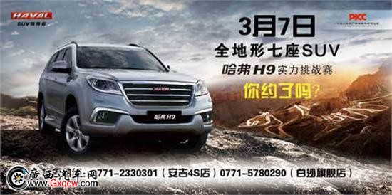 好消息!3月7日廣西長(zhǎng)道聯(lián)合中國(guó)人壽保險(xiǎn)強(qiáng)強(qiáng)舉辦哈弗H9實(shí)力挑戰(zhàn)賽, 將在廣西長(zhǎng)道安吉4S店野外試駕場(chǎng)隆重開(kāi)戰(zhàn)。哈弗H9實(shí)力挑戰(zhàn)試乘試駕體驗(yàn)會(huì)現(xiàn)已開(kāi)啟全城招募模式!活動(dòng)當(dāng)天,無(wú)論您是汽車愛(ài)好者,或是對(duì)哈弗H9期待已久的準(zhǔn)車主,均可報(bào)名參加本次活動(dòng)!超多試駕禮品,等您來(lái)拿。活動(dòng)當(dāng)天,成功訂購(gòu)愛(ài)車更有意想不到的超值驚喜。