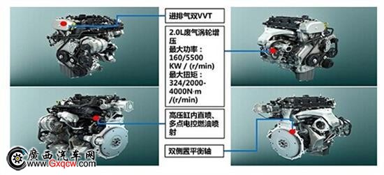 該發(fā)動(dòng)機(jī)主要技術(shù)亮點(diǎn)是:廢氣渦輪增壓,通過廢氣再循環(huán),提高發(fā)動(dòng)機(jī)的功率與扭矩,相較普通發(fā)動(dòng)機(jī)可以增加40%的功率,保障了充足的動(dòng)力輸出。同時(shí),還兼顧了燃油經(jīng)濟(jì)性,采用缸內(nèi)直噴技術(shù),通過內(nèi)置噴油嘴,直接把高壓汽油噴入氣缸,使燃油與空氣混合更均勻,采用雙VVT技術(shù),始終為發(fā)動(dòng)機(jī)提供**進(jìn)氣量,達(dá)到完美燃燒,降低油耗。而靜音鏈正時(shí)系統(tǒng)、雙平衡軸、雙頂置凸輪軸、充鈉空心氣門、高性能活塞連桿輕量化設(shè)計(jì)等先進(jìn)技術(shù)的應(yīng)用,也有利于汽車使用的穩(wěn)定性、降噪和輕量化,大大提高了整機(jī)的高性能與先進(jìn)性。