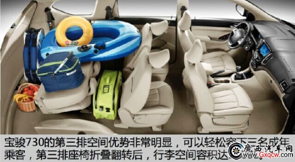 超大空間,真正為7人設計:寶駿730擁有4685/1785/1745mm的車身尺寸,以及超越B級車2750mm超長軸距。相比于幾款市場熱銷的家用MPV,寶駿730的第三排空間優(yōu)勢非常明顯,可以輕松容下三名成年乘客。使用“2+2+3”的座椅布局,車內(nèi)空間靈活多變,22處人性化儲物空間可以滿足使用者的一切需求。此外,在7—8人乘坐的情況之下,寶駿730仍然提供了330L的行李空間,完全滿足家庭日常使用、接送親朋的要求。如果將第三排座椅折疊翻轉(zhuǎn),寶駿730行李空間容積更是達1000L。