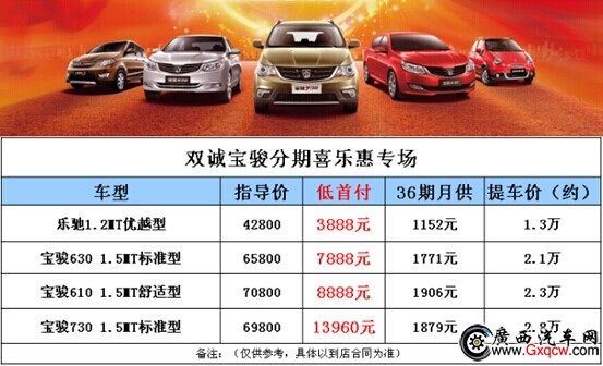 分期有禮:3888元最低首付,寶駿樂馳開回家;7888元首付特惠型寶駿630即可屬于你;8888元首付,駿情版寶駿610助力幸福生活;1.4萬首付寶駿730,包牌僅需3萬即刻提車回家,擁有七座MPV神車,全家齊享幸福羊年!