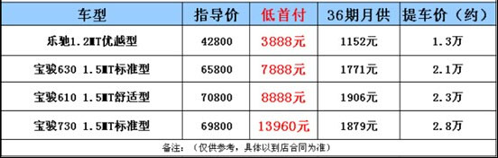 分期有禮:3888元最低首付,寶駿樂馳開回家;7888元首付特惠型寶駿630即可屬于你;8888元首付,駿情版寶駿610助力幸福生活;1.4萬首付寶駿730,包牌僅需3萬即刻提車回家,擁有七座MPV神車,全家齊享幸福羊年!