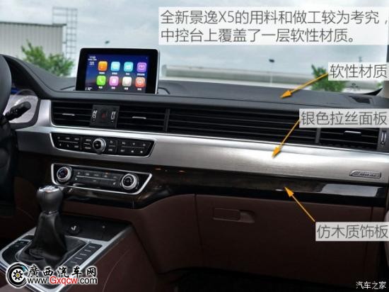在內飾的配色方面沒有變化,全新的景逸X5仍采用黑棕雙色進行搭配。不過在中控臺的設計方面,新款車型有了徹頭徹尾的改變。橫向設計的中控臺視覺效果十分寬泛,其間還加入了銀色拉絲面板及仿木質飾板的雙重搭配。