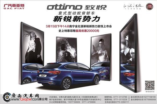 廣汽菲亞特Ottimo致悅將于3月15日在廣汽菲亞特南寧金壯源上市,純正意式掀背風(fēng)潮觸手可及,到場即可領(lǐng)取精美禮品,現(xiàn)場還有神秘活動!將為您打造一個不一樣的3·15視覺盛宴。