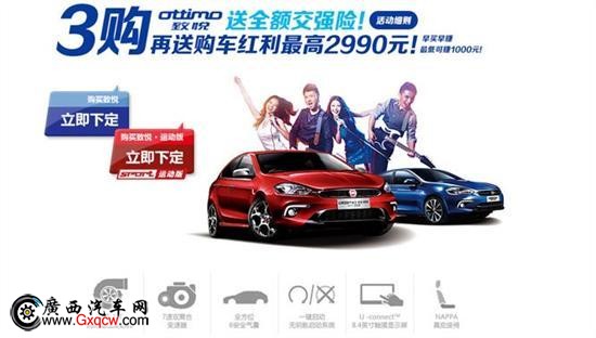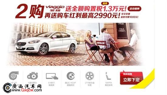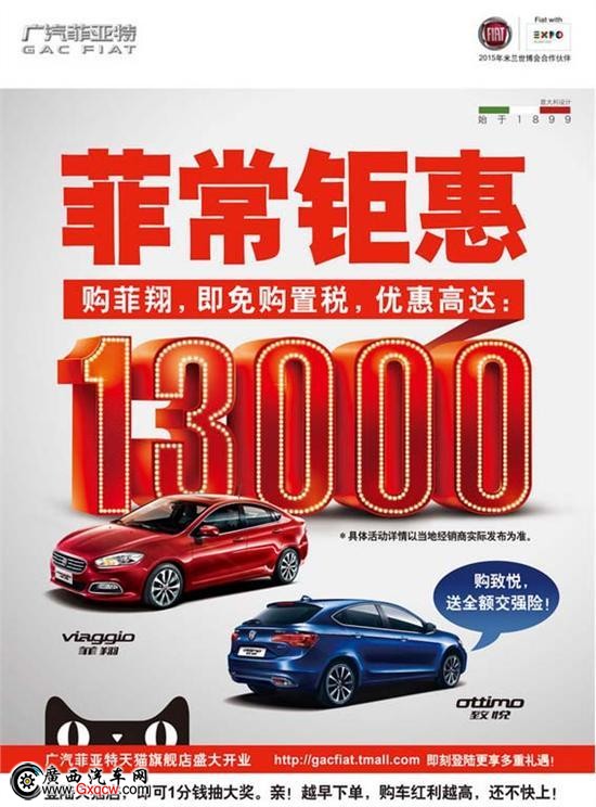 活動(dòng)期間,在廣汽菲亞特官方天貓旗艦店購(gòu)置菲翔即送全額購(gòu)置稅,購(gòu)買(mǎi)致悅則贈(zèng)送全額交強(qiáng)險(xiǎn)。