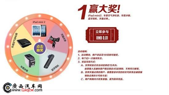 進(jìn)入廣汽菲亞特天貓旗艦店即可參與幸運(yùn)抽獎(jiǎng),總共超1,000個(gè)中獎(jiǎng)名額。你難道不想來(lái)檢驗(yàn)一下你的人品嗎?IPAD Mini、車(chē)載冰箱、車(chē)載空氣凈化器、天貓點(diǎn)券(商城通用)、藍(lán)牙耳機(jī)等獎(jiǎng)品均有機(jī)會(huì)收入你囊中哦~