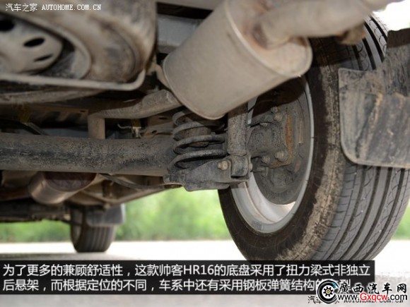 為了提供良好的舒適性,這輛帥客HR16并沒有采用鋼板彈簧懸架,而是采用的扭力梁后懸架,減振器和螺旋彈簧的組合在經(jīng)過坑洼路面或者減速帶時對于振動的吸收顯然要比鋼板彈簧更好。不過由于試駕時間短暫,所以我們沒有對它的底盤做更為細致的體驗,總體感覺它的隔音和高速穩(wěn)定性兩方面都令人滿意。