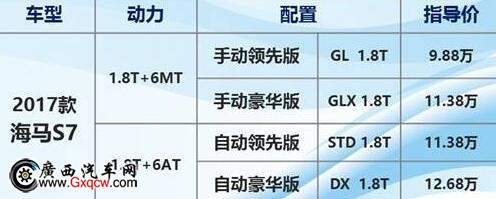 1月25日,海馬旗下全新2017款海馬S7正式全國(guó)上市,其以超強(qiáng)動(dòng)力、超高顏值及超準(zhǔn)駕控等車型亮點(diǎn),高度契合國(guó)內(nèi)消費(fèi)者的SUV用車需求。2017款海馬S7全系搭配渦輪增壓T動(dòng)力,有四款車型可供選擇。分別為1.8T+6MT手動(dòng)**版/豪華版和1.8T+6AT自動(dòng)**版/豪華版,售價(jià)分別為9.88萬/11.38萬/11.38萬/12.68萬元。為慶賀新年,在1月26日-2月25日春節(jié)期間訂車還可額外享受3888元現(xiàn)金紅包。