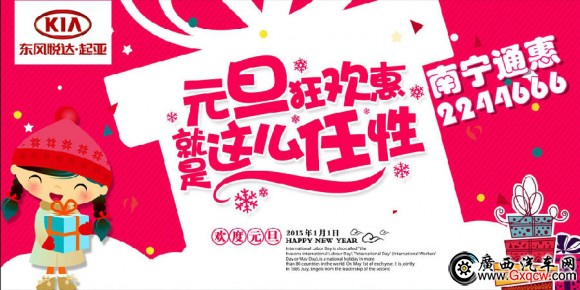 新年到來(lái)之際,東風(fēng)悅達(dá)起亞南寧通惠金牌店攜全體員工祝您在新的一年身體健康,萬(wàn)事如意。希望大家在新的一年都能選到自己如意的車型!南寧通惠店已經(jīng)連續(xù)12年獲廣西區(qū)銷量冠軍,2015年將再創(chuàng)輝煌!值此辭舊迎新之際,南寧通惠店特推出如下促銷活動(dòng),詳詢東風(fēng)悅達(dá)起亞南寧通惠4S店24小時(shí)銷售熱線:0771-2244 666 ,地址:南寧市白沙大道69號(hào)(白沙友誼立交旁)。